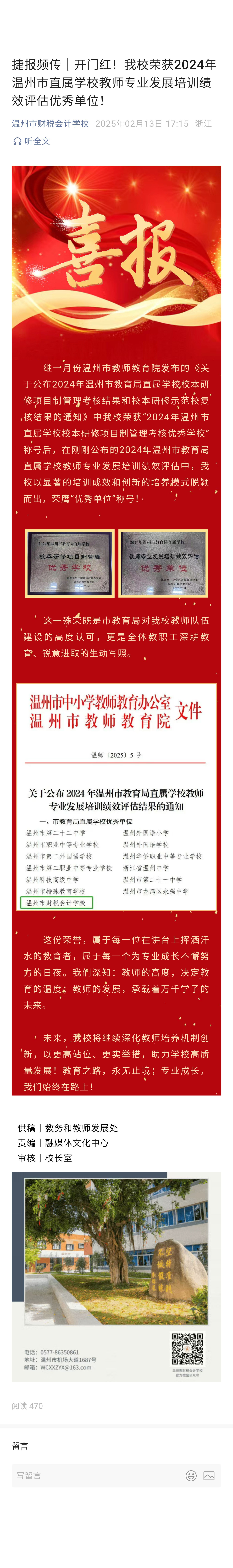 捷报频传|我校荣获2024年温州市直属学校教师专业发展培训绩效评估优秀单位