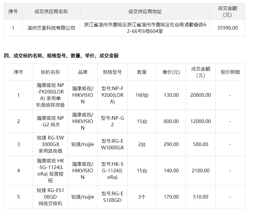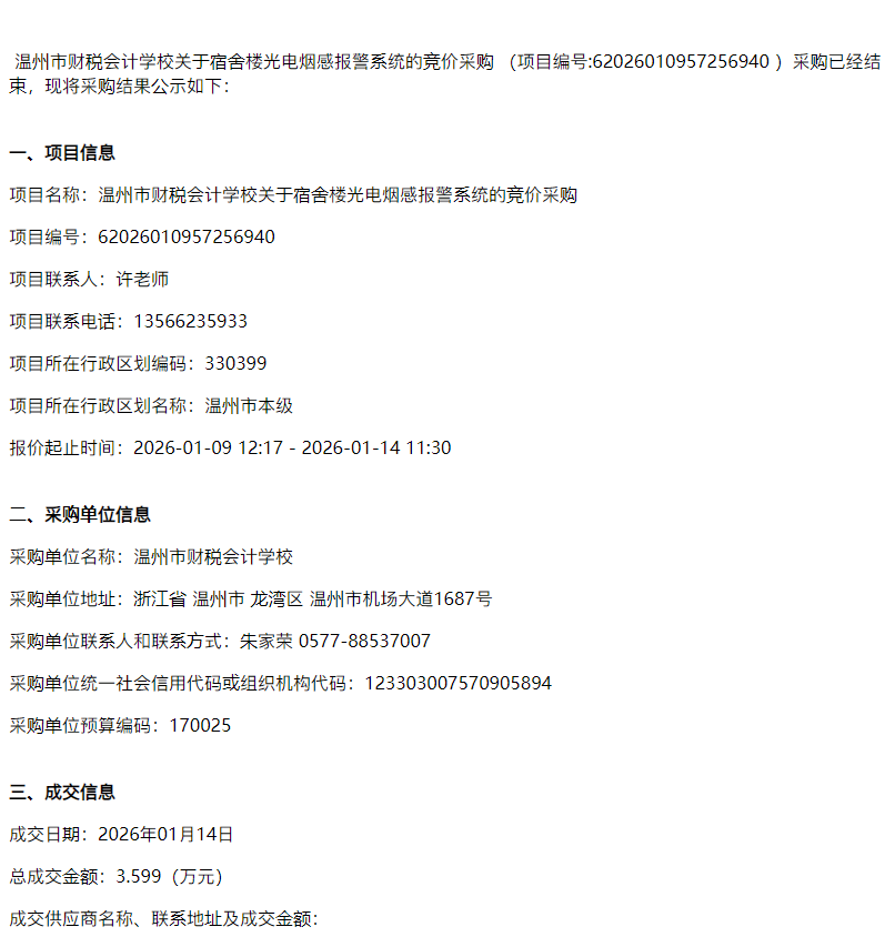 温州市财税会计学校关于宿舍楼光电烟感报警系统的竞价采购竞价成交公告