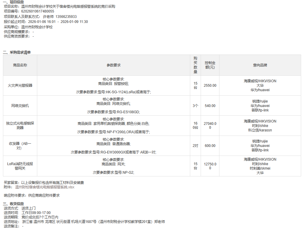 温州市财税会计学校关于宿舍楼光电烟感报警系统的竞价采购竞价公告